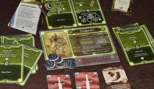 Персонаж прикольный, непростой. В колоде преобладают дальние атаки и атаки по местности (камнемёт же!), имеются “стойки” с retaliate, очень много свойств с усилением/применением зелёной стихии. Но главная отличительная особенность – приёмы на манипуляции с объектами.