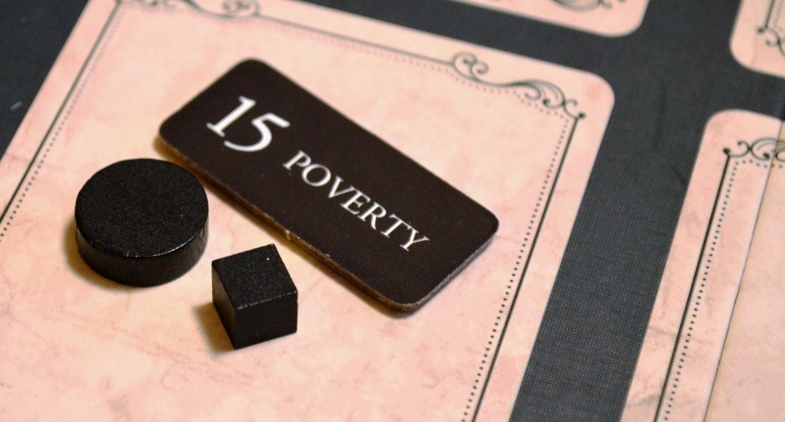 Очки начисляются за оставшиеся фунты (3 фунта = 1 ПО) и карты в стопках, в том числе и перевёрнутые. Затем сравнивается уровень бедности. Игрок с наименьшим количеством чёрных кубиков сбрасывает все, остальные – ровно столько же. А вот за излишек снова придётся расстаться с победными очками согласно специальной таблице.