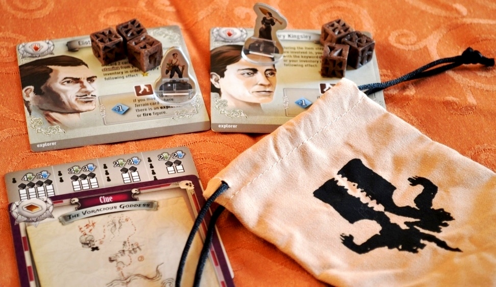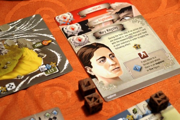 А теперь, собственно, о наших приключениях. Я играл за своего старого знакомого врача-терапевта из Сербии Василия Ковачевича, скрывающегося под псевдонимом Элиот Пэнделтон. Катя же выбрала даму с веслом Мэри Кингсли, которая увлекается изучением местных племён и видов рыб. Как и полагается, в колоду действий нам добавились уникальные карты этих персонажей: у Васьки, в основном, на лечение, а у Мэри – на рыбалку и плавание.