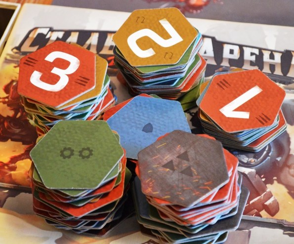 Да, лучше стало, но ненамного. Всё же хочется, чтоб на рубашках был хоть какой-то намёк на местность. Ну, чтобы игровое пространство было действительно похоже на арену. Вдобавок, теперь при делёжке тайлов по поколениям нужно очень внимательно присматриваться к числу пуль, шестерёнок и прочих значков.