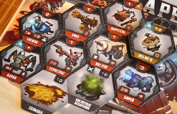 Способности. Тут всё по классике. Какой же боец, да без спец-свойств. За них теперь отвечает набор двухсторонних карточек. Берём карту, выбираем сторону и вуаля – ваш подопечный получает дополнительный навык. Это может быть либо усиление центрального модуля (сила 2, а не 1 и т.п.), либо уникальный постоянный или одноразовый эффект (к примеру, активация раз за игру перегретого модуля атаки, который потом сбрасывается).