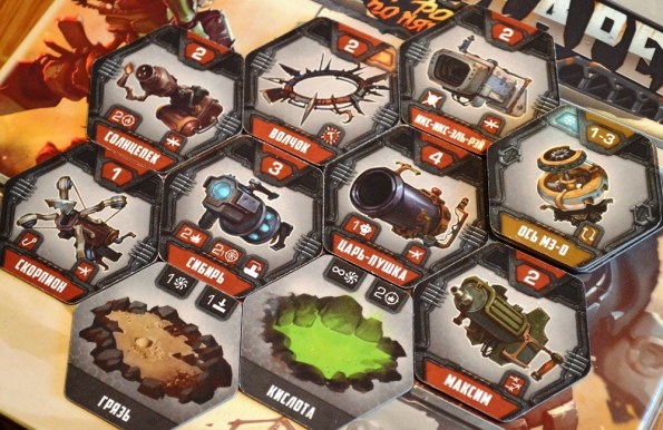 Мины. Хотите больше подлянок и неразберихи? Тогда раздайте каждому по два жетона мин с разными эффектами. Мину можно выложить взакрытую на свой тайл либо перед движением, либо после. На неё потом можно толкнуть врага или подорваться самому, чтобы закомбить определённый эффект с прочими спланированными действиями – ведь мины могут не только нанести урон, но и отбросить в нужную локацию.