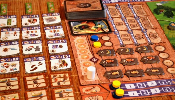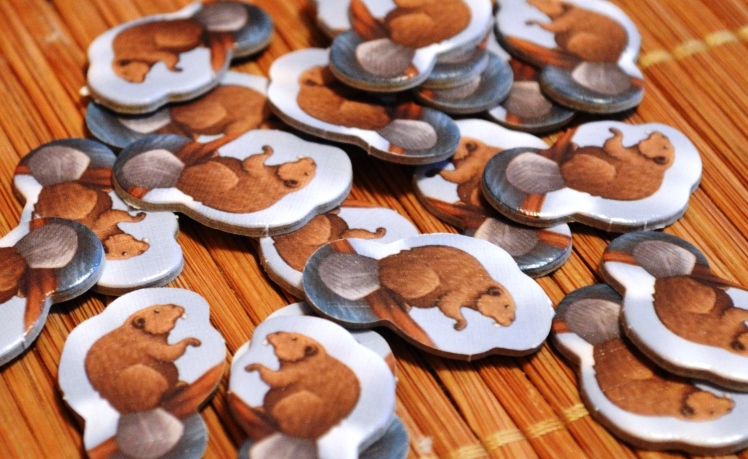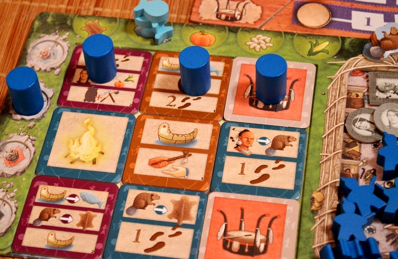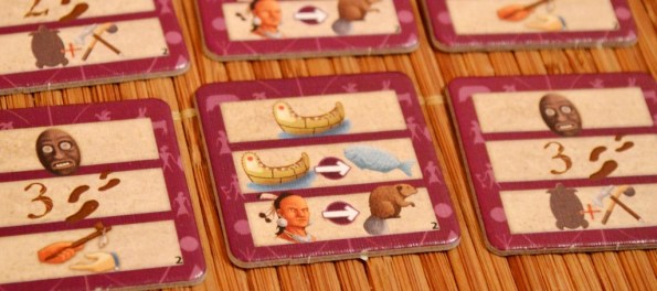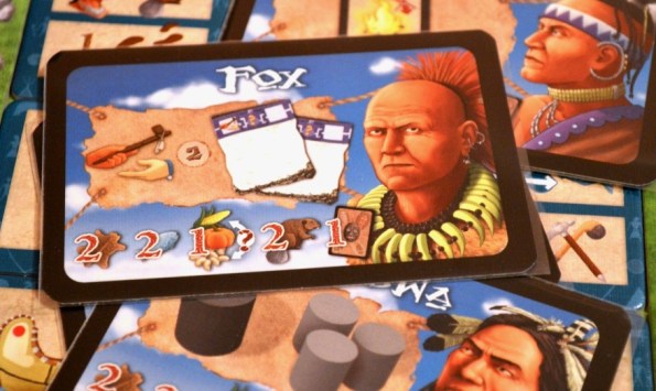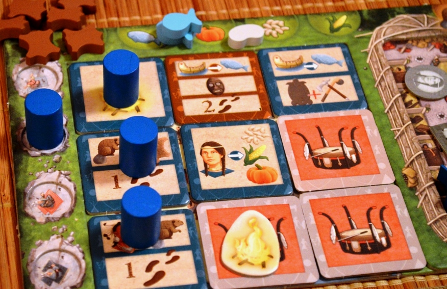 Берём полагающихся нам бобров, шкуры, рыбёху, овощи и карты масок, получаем дополнительные фишки или жетоны, предписанные способностью племени, и всё – можно начинать!