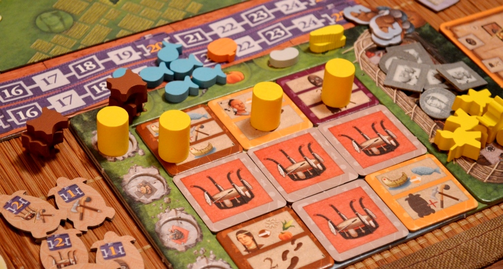 В общем, принцип игры понятен: разбредаемся по локациям, добываем ресурсы, улучшаем своё племя через тайлы развития и продвинутые действия да попутно зарабатываем очки на заветных треках.