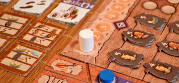 Партия длится 7 раундов, и каждый раунд игроки просто распределяют по 4 деревянных цилиндра: три из них следует выставить на личный планшет, а один – на трек очерёдности хода.