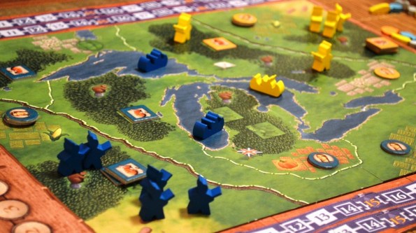 Каноэ. Просто выставляем фишку лодки на поле. В какое озеро, значение не имеет.