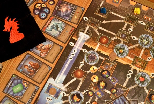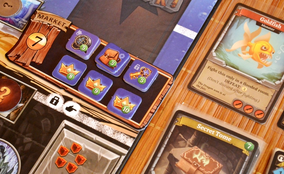 Clank! Sunken Treasures. Впервые разложили первое дополнение, залежавшееся с прошлогоднего Эссена. В комплект допа входит двустороннее поле с затопленным замком и пиратским кораблём; стопка из 35 карт, разбавляющая базовую колоду новыми монстрами, союзниками и полезным лутом; немного жетончиков сокровищ; а также акваланги, которые добавляются на рынок к остальным предметам.