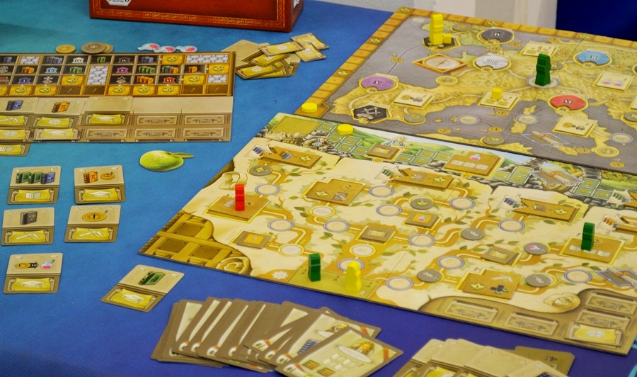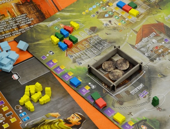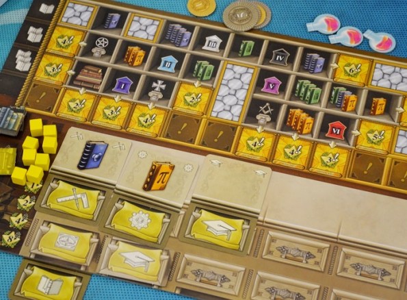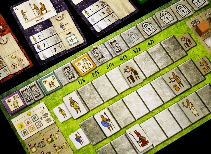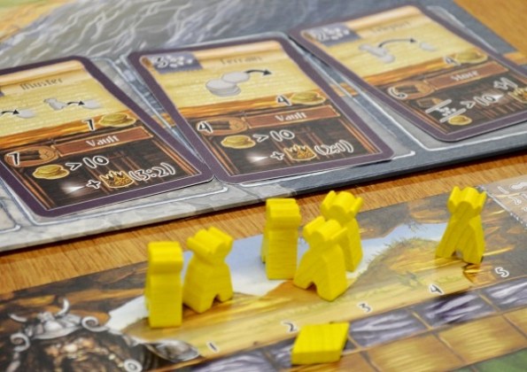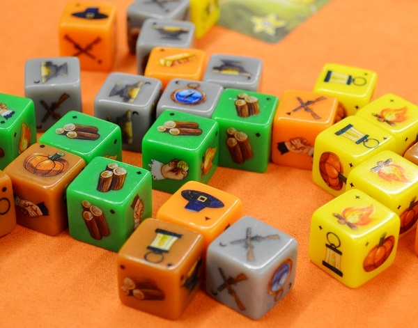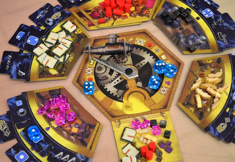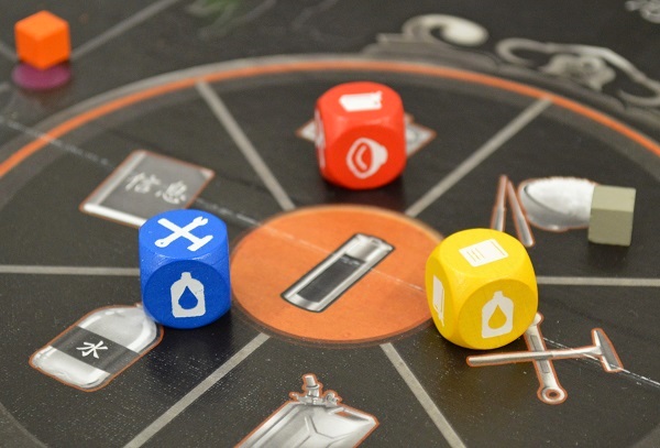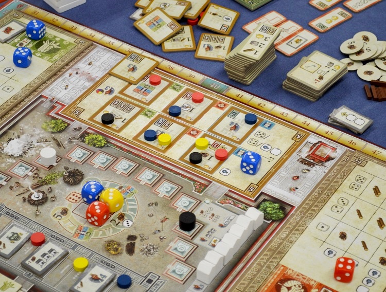 Вторая оригинальность: выполняя базовые действия, игроки постепенно прокачивают своих рабочих, переворачивая кубики на грани повыше. Сила же действия на выбранной локации зависит и от значений, и от количества твоих кубов.