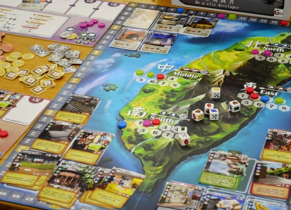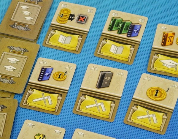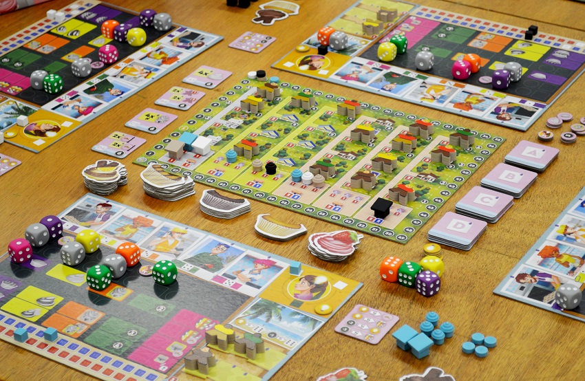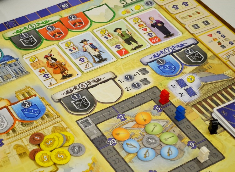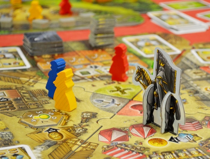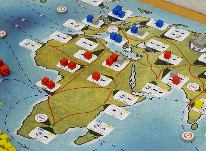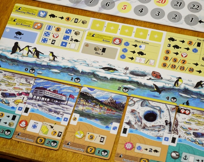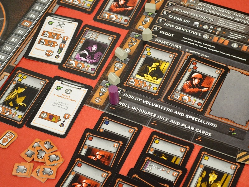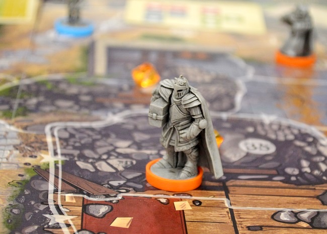 Вторая оригинальность: выполняя базовые действия, игроки постепенно прокачивают своих рабочих, переворачивая кубики на грани повыше. Сила же действия на выбранной локации зависит и от значений, и от количества твоих кубов.