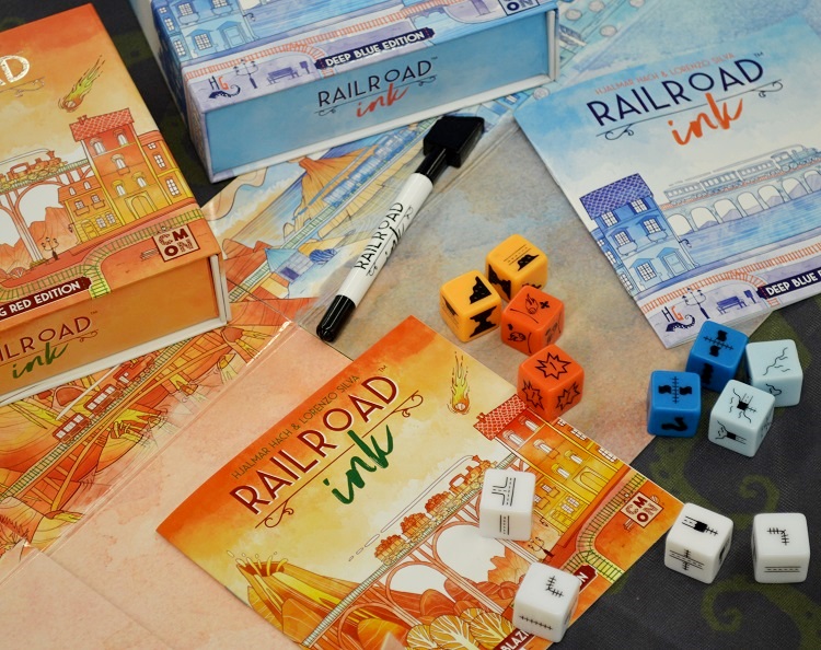 Вышла сразу в двух вариантах: Deep Blue и Blazing Red. Но тут не так, как в Pandemic: Legacy, где разные только обложки. В Railroad Ink цвет коробки означает, какой набор специальных кубиков внутри. Хотите дополнительно два куба – берите вторую копию. Хитро!