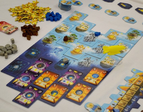 Solenia. Несложная семейка с интересным концептом смены дня и ночи через переворот участков поля. В остальном обычный сбор ресурсов и выполнение контрактов посредством розыгрыша карт с циферками. Ещё одна фишка – при всей соревновательности игроки управляют одним кораблём.