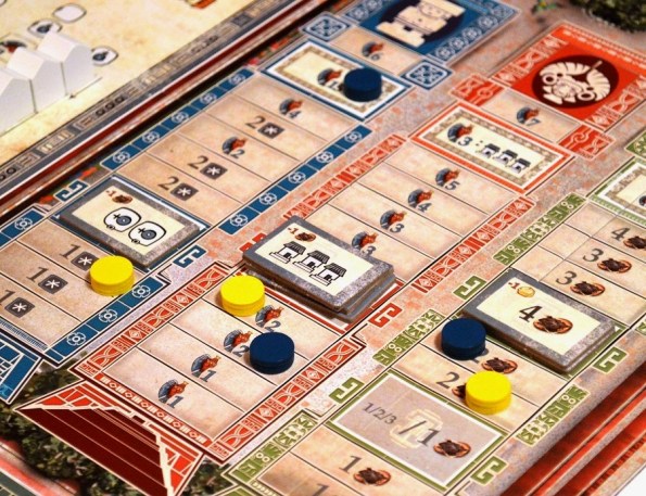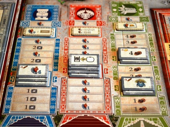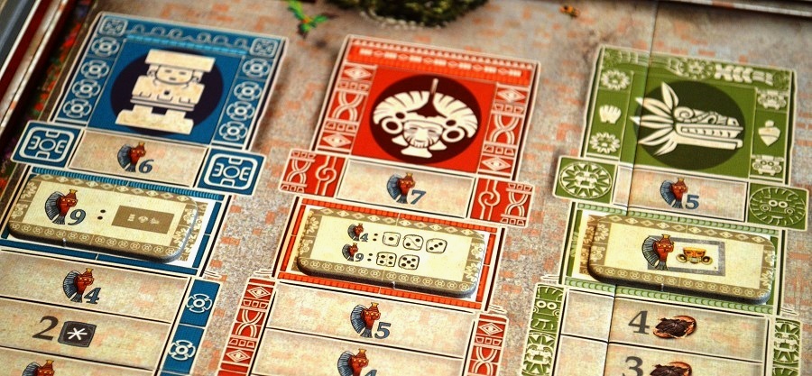 По основным действиям вкратце всё. Что касается поклонения богам, то его можно совершить только в локациях, где есть зоны с ключиком. В этом случае игрок не платит какао за других, а просто выставляет кубик на клетку с ключом и получает указанный бонус. По желанию можно скинуть одно какао, чтобы дополнительно взять жетончик открытия.