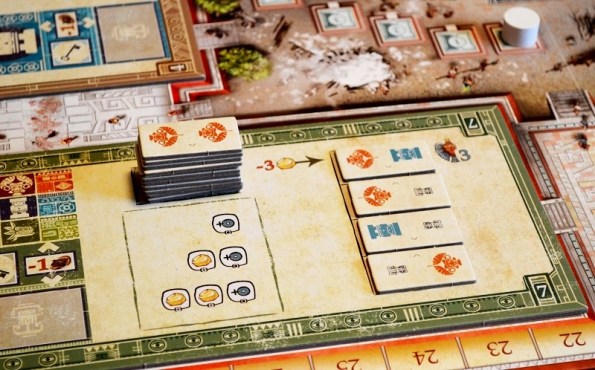Ну и наконец, перемешав кучу жетонов открытий, их необходимо выложить в специальные места на некоторых локациях, на треках храмов и на треке Дороги мёртвых. Последние штрихи – это диски раундов и фишки зданий.
