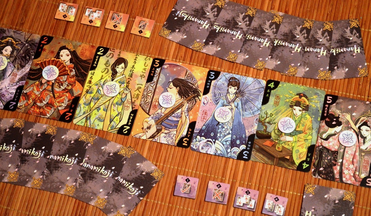 Игру по праву можно называть “микро”, так как в коробке лишь 28 карт и горстка жетонов. Чтобы набить цену и привлечь внимание к очередному филлеру, многие издатели зачастую прибегают к бессмысленному раздуванию коробки или изготовлению overpriced компонентов. В Hanamikoji же решили хорошенько поработать над оформлением, чтобы во время партии игроки могли наслаждаться чудесными иллюстрациями миловидных японских барышень. Хотя… я бы не отказался ещё и от каких-нибудь кастомных деревянных фишек вместо слабо заметных жетончиков одобрения.