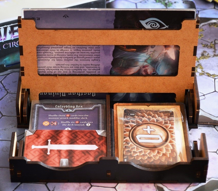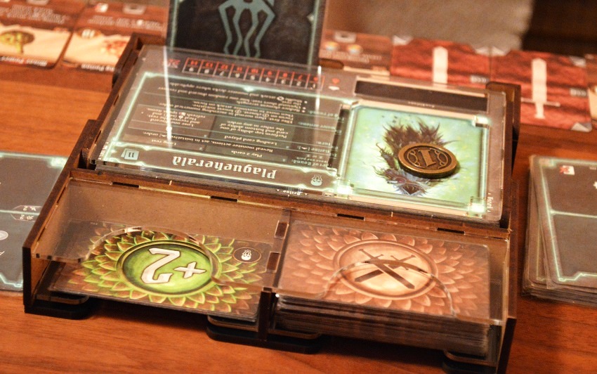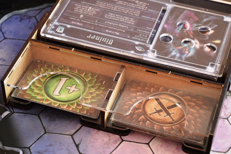 Под крышкой два отсека под карты и жетоны, которые можно разложить, как душе угодно. Логичнее всего отдельно текущую деку действий и боевых модификаторов, а в другое отделение остальное.
