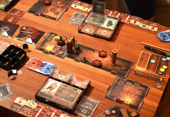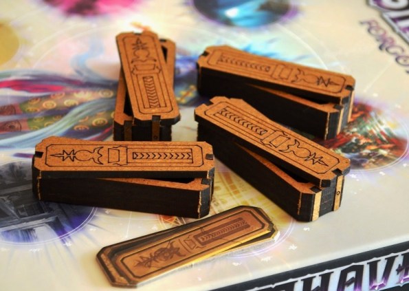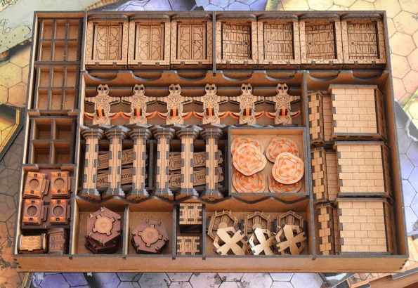 Для хранения в коробке громоздские, эт да, но на столе же занимают место, сколько планшет и колода модификаторов. Мне нравится, что получается, как сундук с твоим добром, туда и монетки можно по ходу игры скидывать :). Я, правда, ещё бы делал вариант без верхних отсеков для мелких карт.