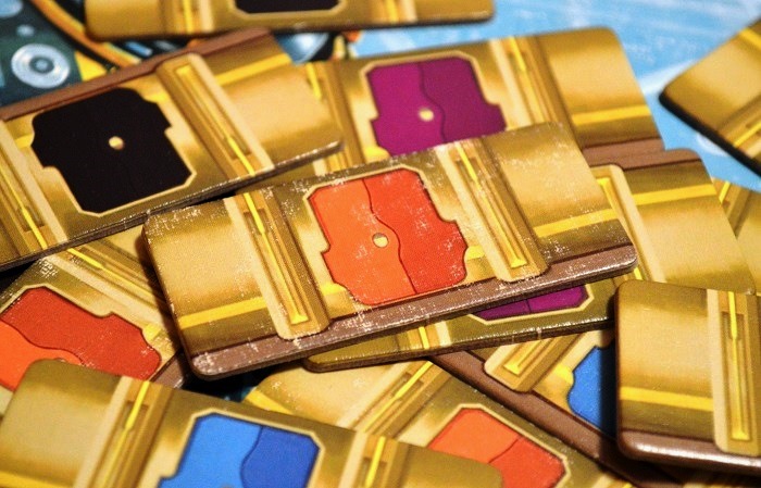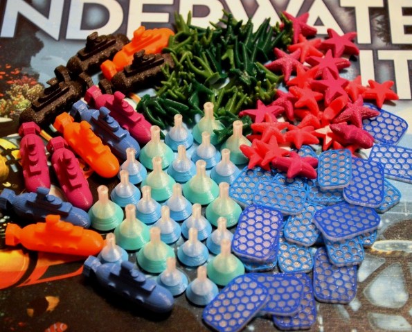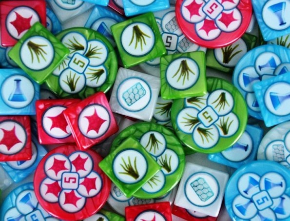 В комплекте 112 фишек: 12 батискафов и 100 ресурсов (что больше, чем в оригинале).