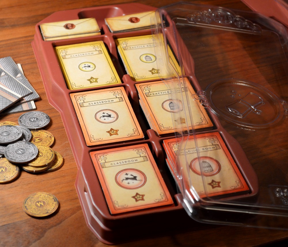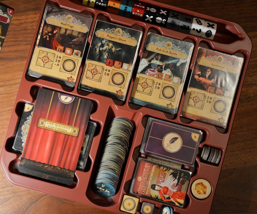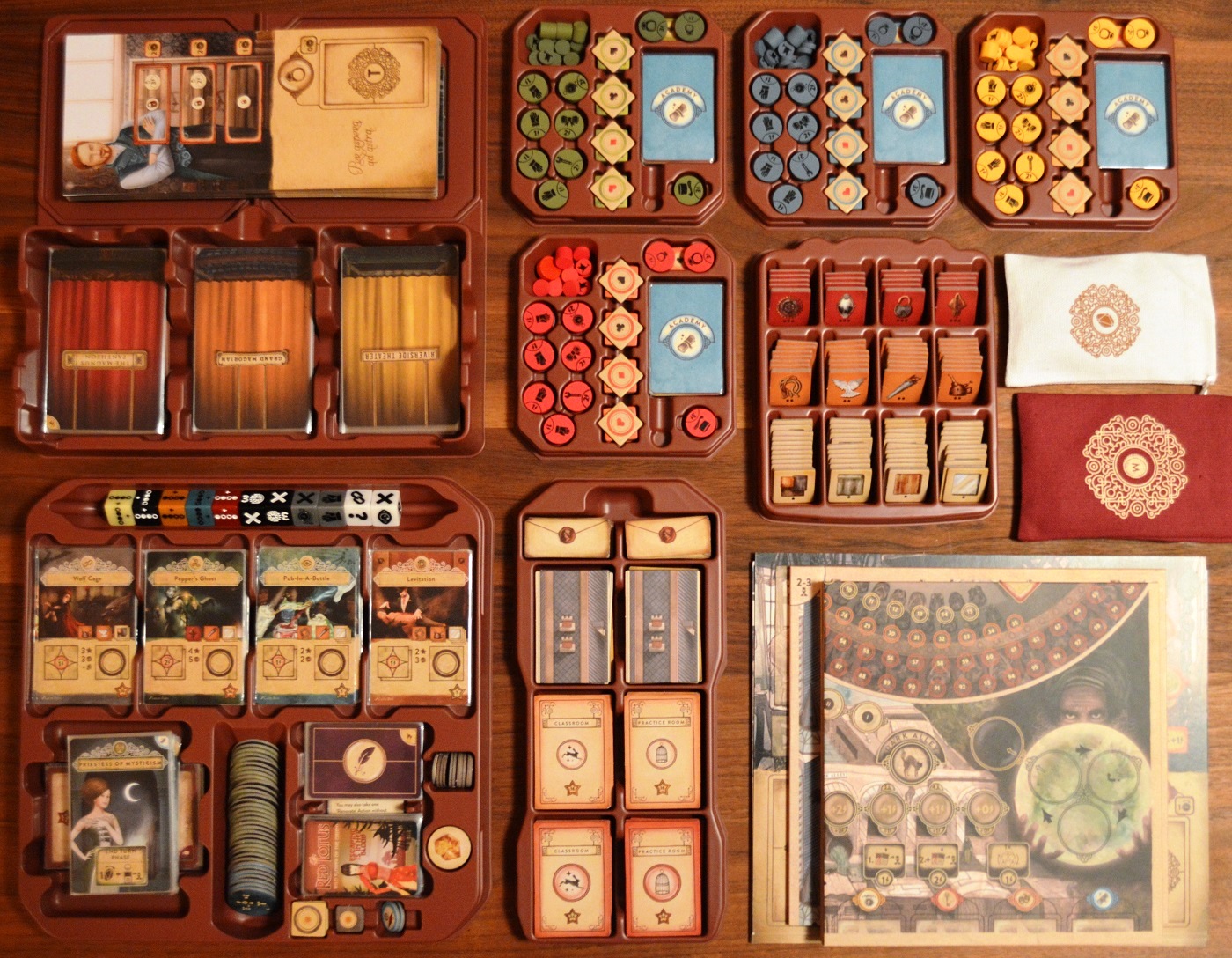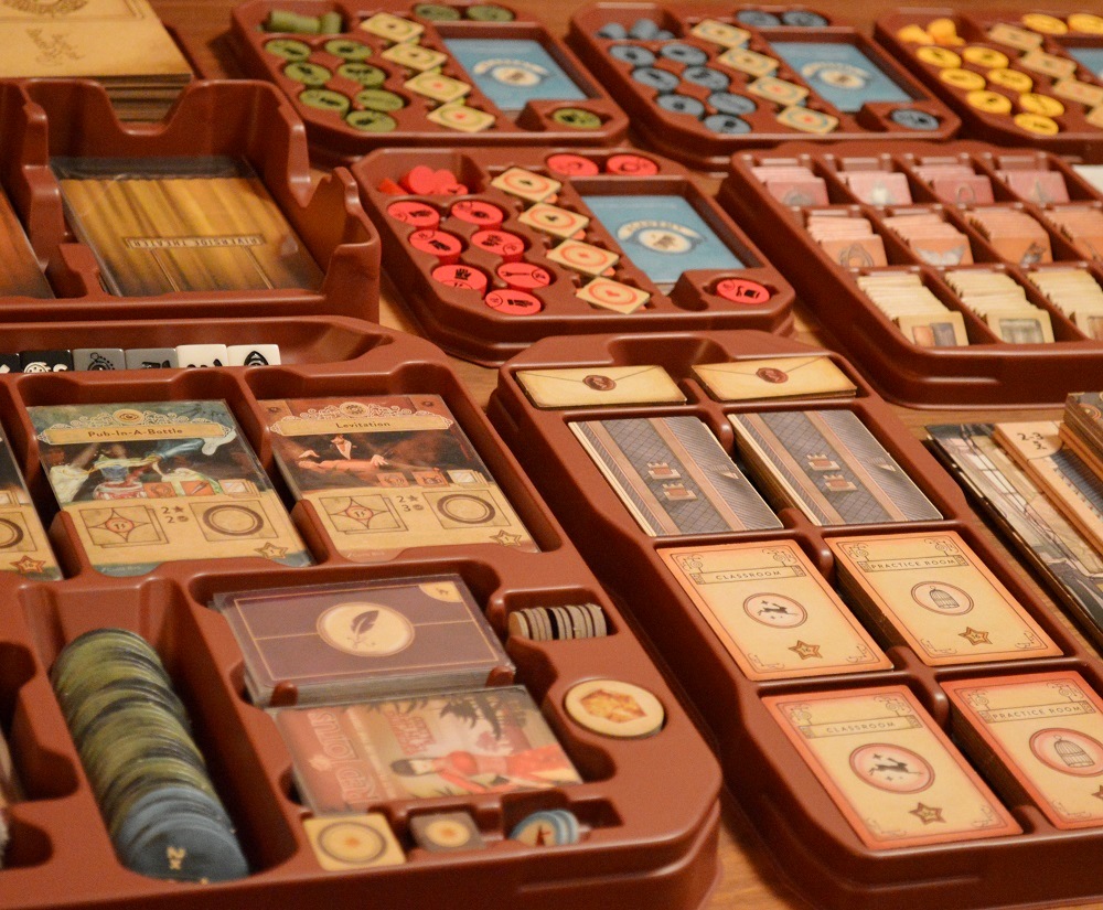 Выше компоненты дополнения: тайлы комнат академии и секреты. Ниже лоток для карт трюков, кубиков и компонентов для соло-режима.