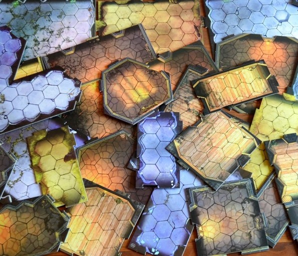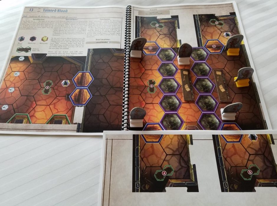 Что же с остальным картоном? А вот тут самое интересное – его почти не будет. Тайлы поля и бесчисленные элементы террейна заменят листы книги сценариев и правил. Ниже вы видите, как это будет выглядеть. В плане сокращения времени подготовки идея огненная. Конечно, какие-то вспомогательные жетоны ещё останутся, но их будет совсем мало. Меня только волнует, насколько удобно будет играть на книжках.
