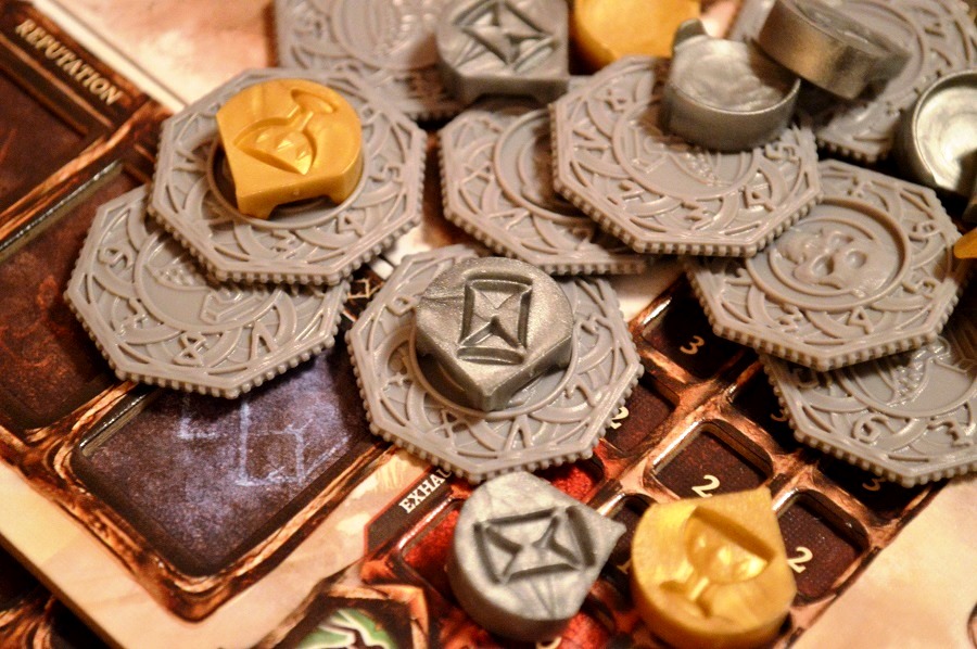 Для монеток имеются ещё специальные фишки-крутилки, с помощью которых отслеживается время. Выглядит, конечно, любопытно, но, по-моему, во время партии с этими счётчиками будет много ненужной возни.