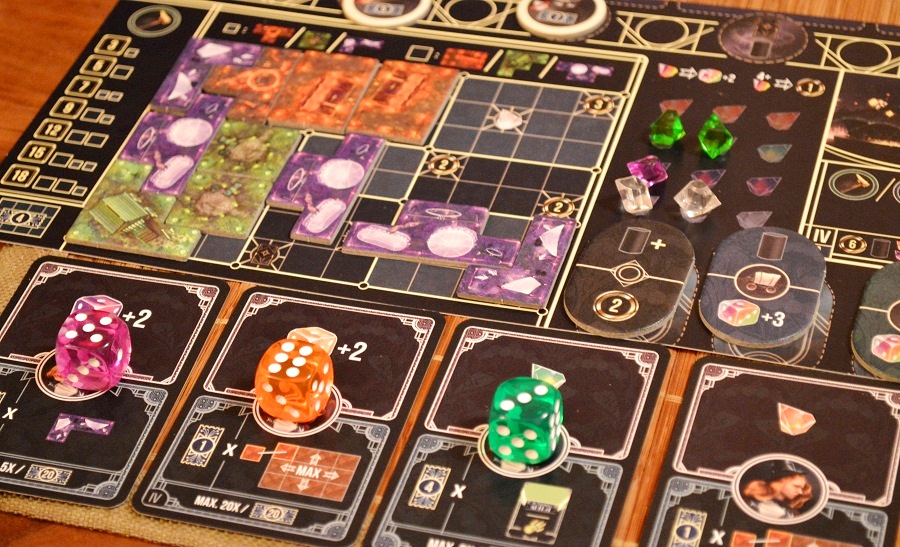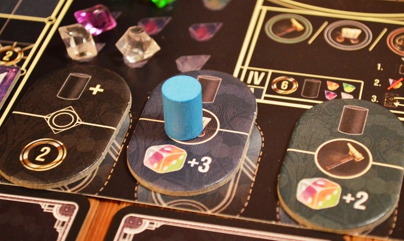 Но и это ещё не всё. Увеличить силу можно аж тремя разными способами: кристаллами (+2 за каждый сброшенный такого же цвета); выставив фишку помощника на соответствующий тайл; а также с помощью бонуса с карты мастера, куда, собственно, и отправляются кубики.