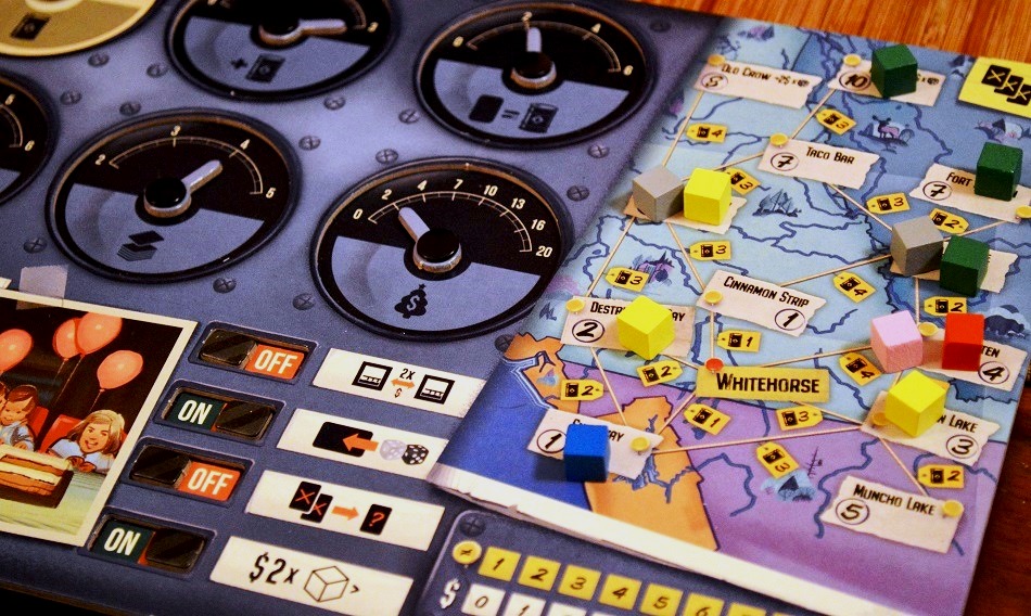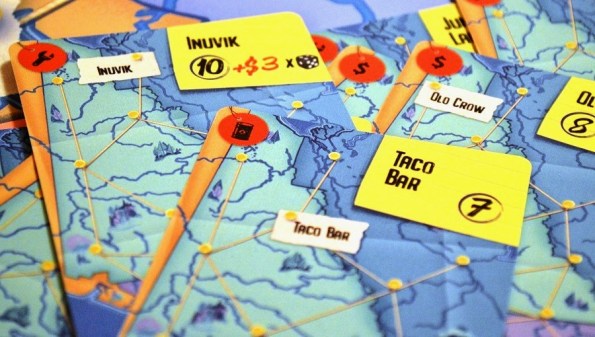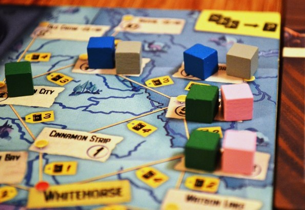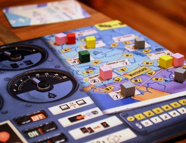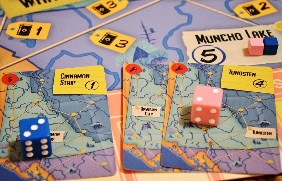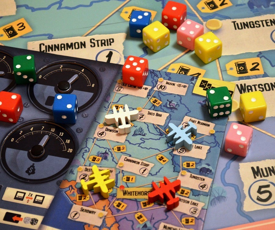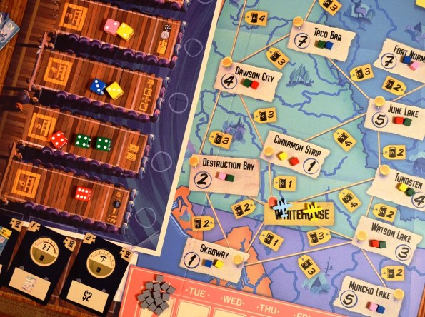 Добавим к этому важность очерёдности хода, случайное распределение цветных кубиков по локациям Юкона и набор целей, которые тоже желательно выполнять, ведь они могут наградить притоком карт билетов, очками, топливом и даже улучшениями.