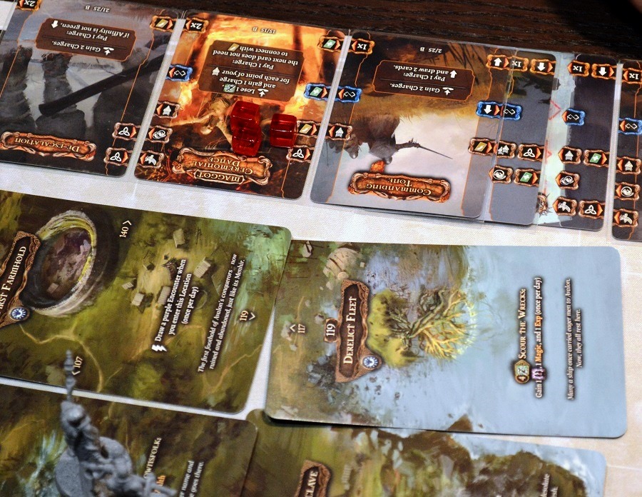 Сделаю некропост. Пятый сценарий добавил преследователя и убил интерес к игре. Мы на не очень удачном моменте завершили предыдущий сценарий и в итоге этот преследователь вывалился на нас в таком раскладе, что даже сбежать от него было тяжело по ресурсам (двое из троих сваливались в изнеможение, а постоянные атаки преследователя просто не давали продохнуть). Как итог, из-за скачка сложности и крайне неудачно сложившихся карт событий (атаки монстров и усложнение перемещений) завели кампанию в тупик. Перезапускать же игру с нуля желания нет