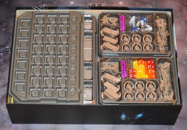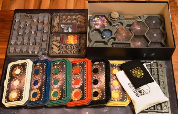 Что сразу бросается в глаза, так это система органайзеров от Game Trayz, зарекомендовавших себя с хорошей стороны. Всё, что я клеил из пенокартона для первого издания, тут уже в комплекте: поддон для деталей кораблей, лоток для технологий, коробочки для каждого игрока, два мелких органайзера для мелочёвки и один большой для тайлов и всего остального.