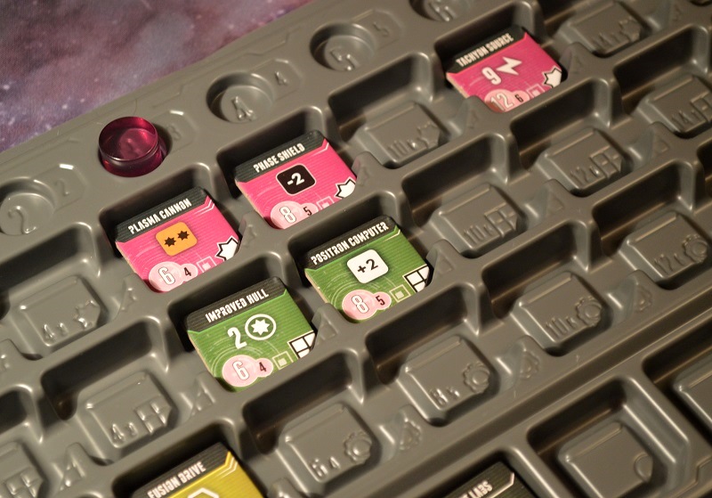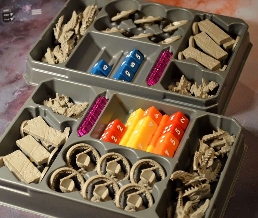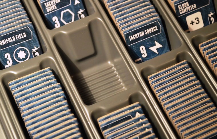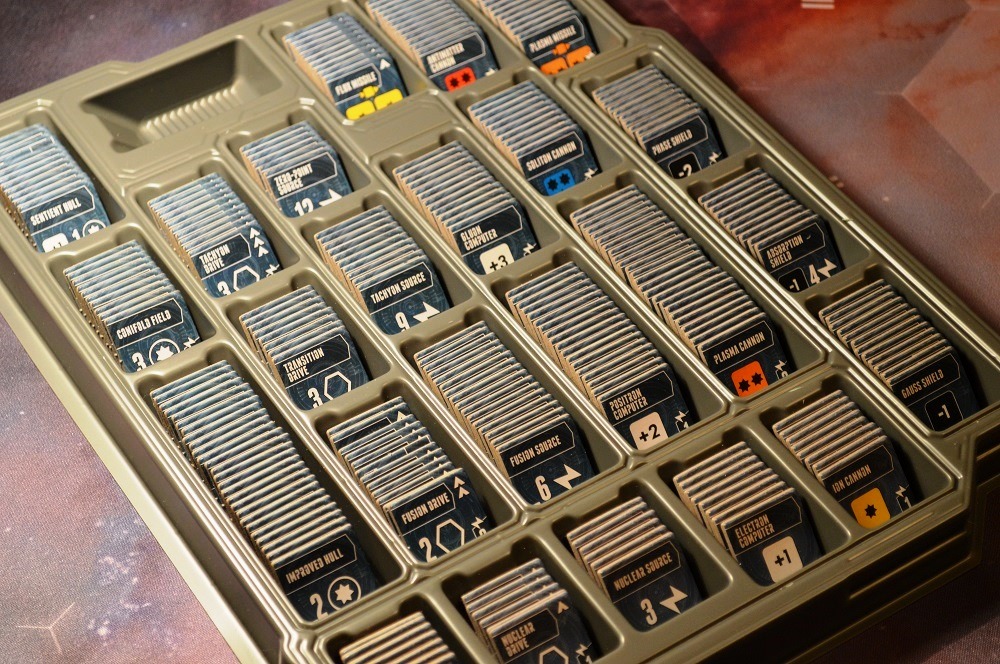Все органайзеры выполнены из плотного пластика и продуманы до мелочей. Например, отсеки поддона для частей кораблей снабжены ребристым дном для определённого количества жетонов. А лоток для технологий имеет маркировку стоимости, типа, а также трек раундов.