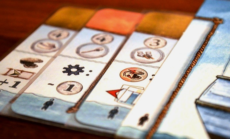 Ещё один неоднозначный момент – медленный старт. Но тут приходит на помощь укороченный вариант от автора, выложенный на BGG. Он делает партию быстрее на 2 раунда, а игроки сразу начинают не только с лицензией, но и на выбор либо с одним членом экипажа, либо с одним улучшением для лодки. И я вам скажу, что 6 раундов в самый раз. Старт не такой тягомотный, а игра почти сразу переходит в бодрую фазу с ощутимой выгодой от апгрейдов. Кроме того, та самая цикличность ощущается гораздо меньше.