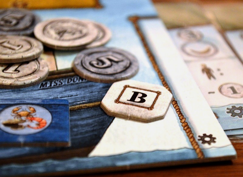 Стоит упомянуть, что при выборе некоторых бонусных действий игроку полагается жетончик с буквой “В”. Такой жетон в любое время можно потратить либо на добор карты, либо в качестве джокера во время оплаты ловли (если, допустим, позарез нужна устрица, а на руке нету), либо для дополнительного продвижения по треку порта.