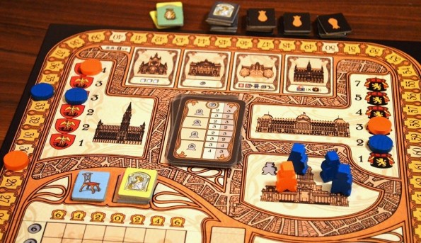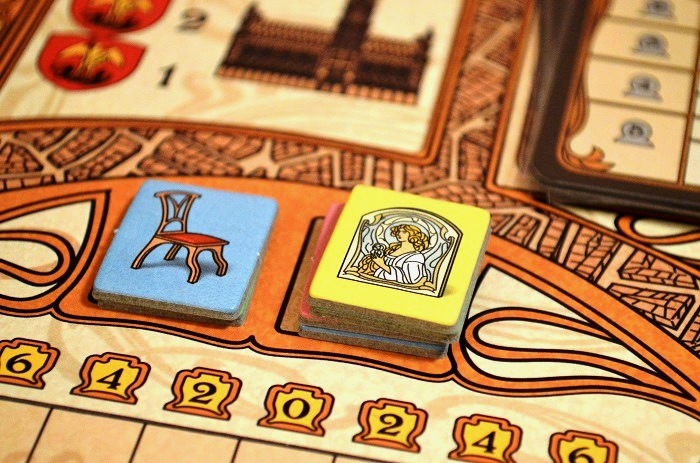 А ещё после аукциона проверяется, есть ли окружённые миплами гербы. Если таковые имеются, то теперь считается, чьих фишек больше – этот игрок награждается очками согласно специальному треку (да, его тоже можно прокачивать).
