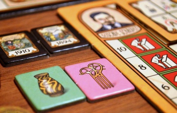 В конце раунда проходит аукцион, не зря же игроки выкладывали монетки на поле ар-нуво. Проверяется каждая колонка. У кого денег в сумме больше, тот и забирает себе бонусную карту под этой колонкой. Бонусной картой можно воспользоваться двумя способами: либо взять плюху с центральной части и сбросить, либо подсунуть под планшет, чтобы увеличить ценность одной из оцениваемых категорий при финальном подсчёте очков.