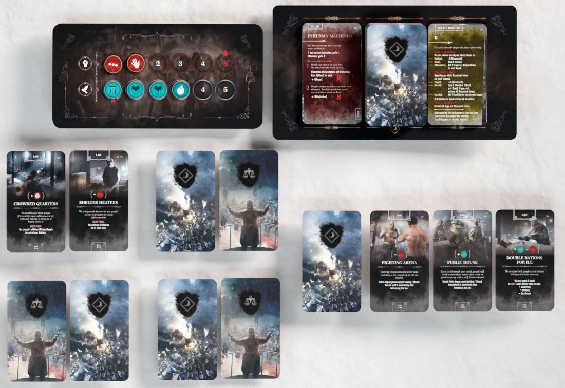 За историю, по большей части, отвечают карты событий. Каждый раунд разыгрывается случайное происшествие или зачитывается требование жителей. Принятые игроками решения зачастую заставят добавить специальное событие в так называемую колоду заката. Вы будете знать, что эта карточка сработает позже, но когда именно, и какие будут последствия, вам неизвестно. Посему, новый жёсткий закон, принятый в спешке, или безразличие к жителям в дальнейшем может привести к печальным последствиям.