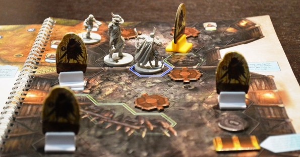 В первый день мы легко отыграли четыре обучающих сценария. Каждый из них примерно на час-полтора. Перед этим мне пришлось лишь выдавить и рассортировать компоненты (а именно, сложить по пакетикам жетоны и карточки монстров) и полистать правила, чтобы понять принцип подачи материала.