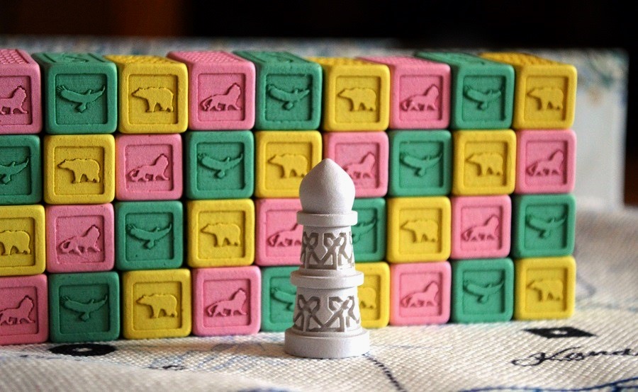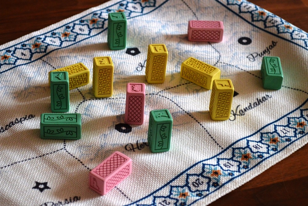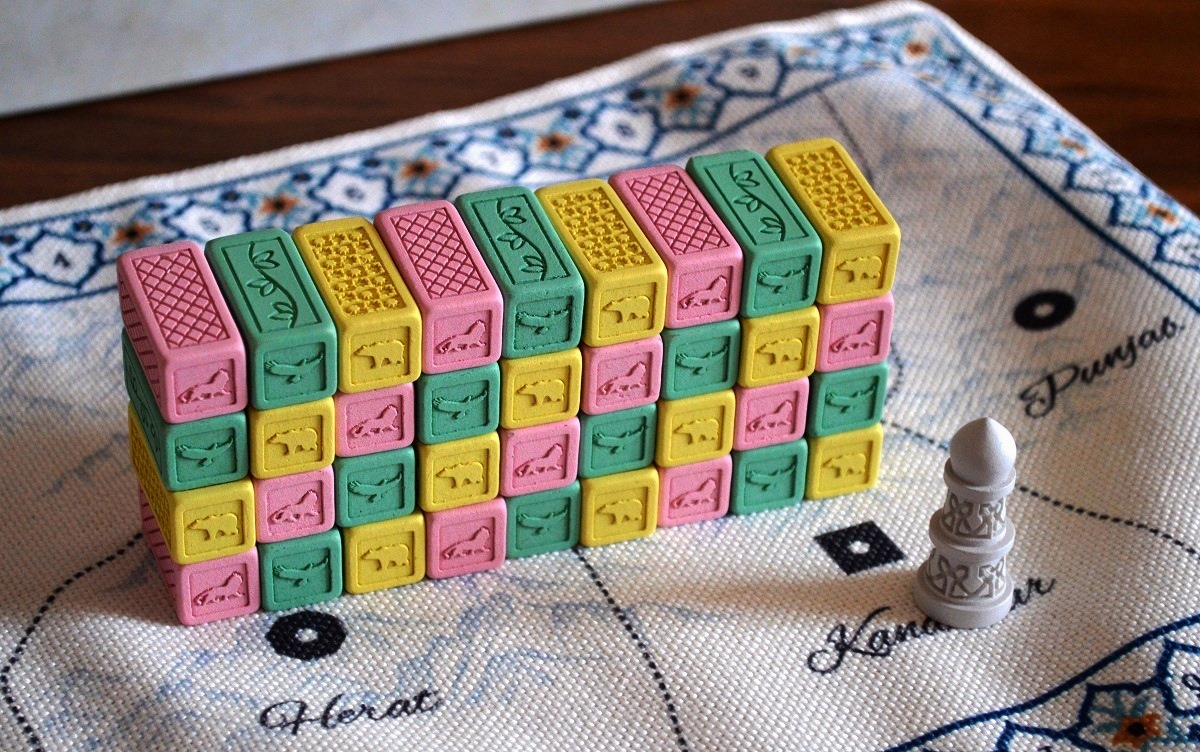 Фишки-бруски очень приятные на ощупь и имеют такой неидеальный hand made вид. Коврик компактный и лаконичный. Всё вмести смотрится стильно. Более того, тяжёленькие бруски не позволяют коврику топорщиться и сами его выравнивают (хранится поле в скрученном виде).