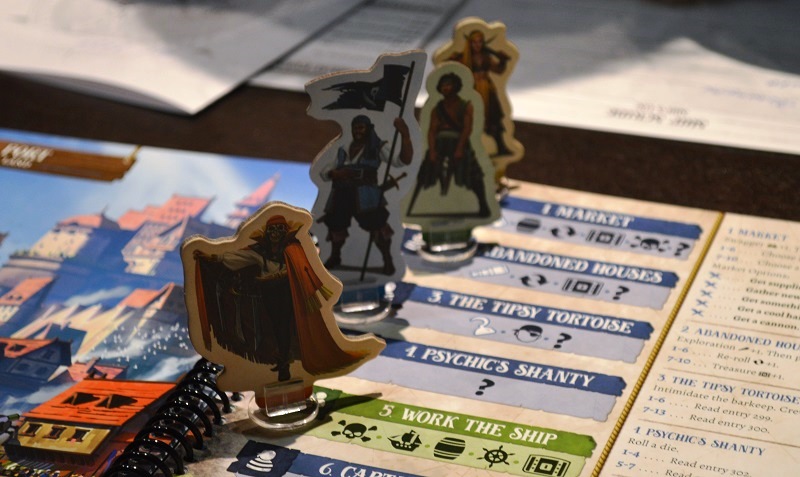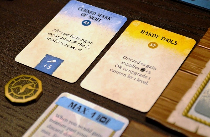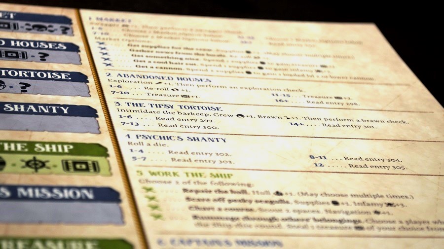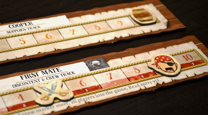Расставили пиратов? Тогда разыгрываем все действия сверху вниз. Ряд действий связан с ненапряжным менеджментом запасов еды, прочности корабля и усмирению экипажа. Другие же действия – это уже специальные события локаций.