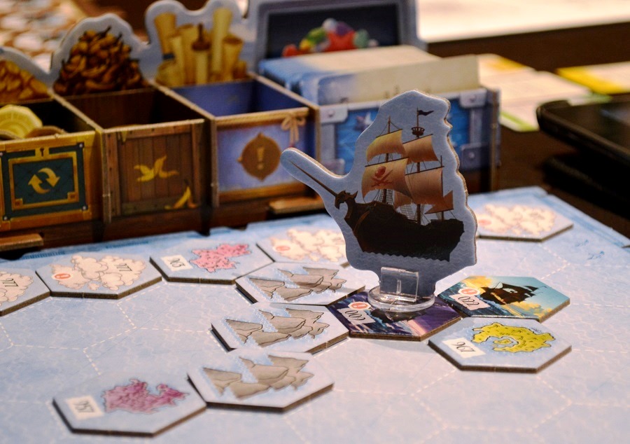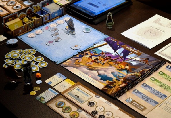 Осязаемых компонентов в коробке не так много: центральное поле, книга локаций, планшеты ролей, листы персонажей, картонные фигурки этих самых персонажей и корабля на подставках, немного двенадцатигранных кубиков, горсть жетонов, а также стопка карт, среди которых преимущественно сокровища и сюжетные карты.