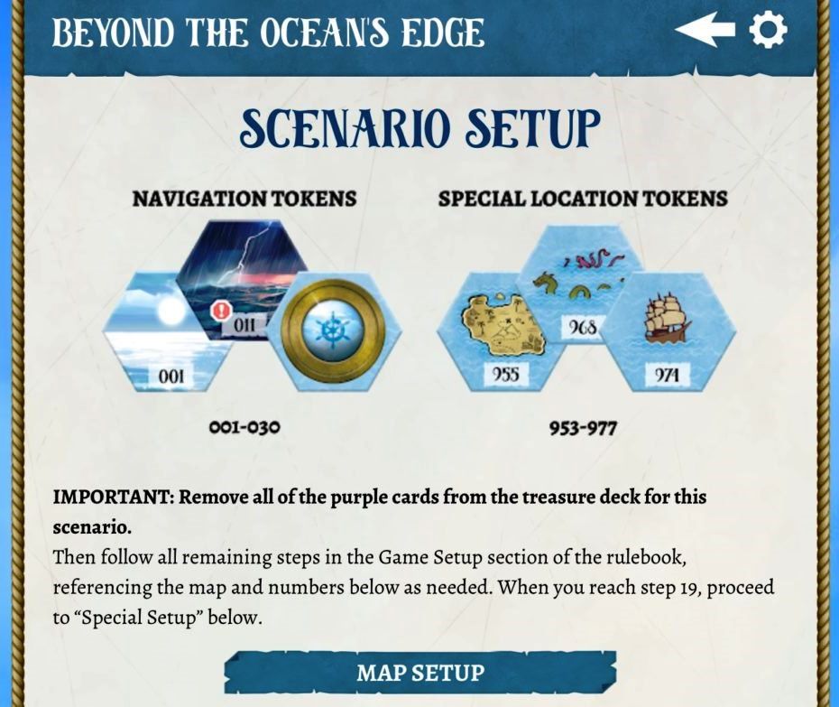 Допустим, ваш корабль достиг неизвестного острова. Вы вбиваете в приложении указанное на тайле острова трёхзначное число, и переходите к конкретному развороту в книге локаций, на котором слева нарисован этот самый остров, а справа перечислены доступные действия и их результат. Как только разворот открывается, игроки запускают таймер на 40 секунд и приступают к размещению фишек персонажей.