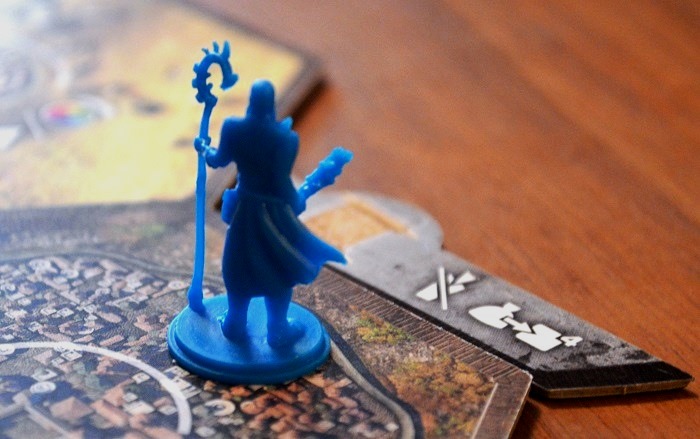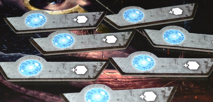Второй модуль – реликвии. Это такие плашки, которые во время подготовки кладутся лицом вниз на каждый гекс вокруг центрального. Заполучить реликвию можно с помощью фигурки аналогично входу в город или руины. Только в этом случае фигурка тепепортируется на домашний тайл, а плашка реликвии кладётся рядом, но уже открытой стороной, где указан полезный эффект.