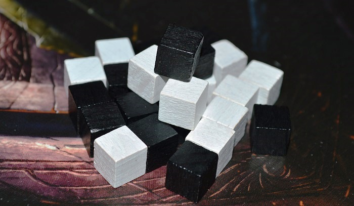 Кубики душ чёрного и белого цветов, и их можно раздобыть только улучшением – прокачав треки получения дополнительных кубиков. Белый кубик можно выставлять на многоцветные ячейки, и при размещении он позволяет дотянуть из мешка ещё один. Свойство же чёрного – его можно ставить на любую цветную ячейку, но только не на многоцветную.