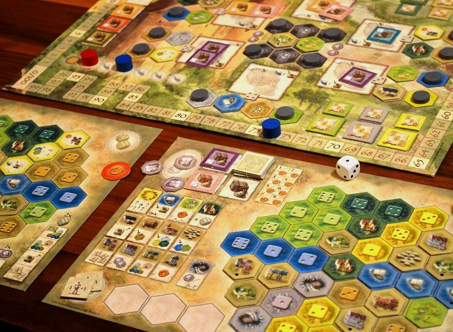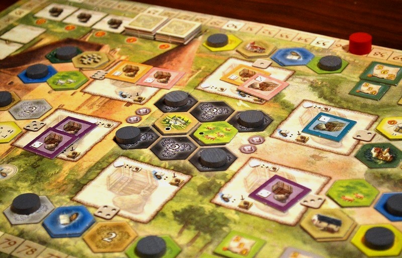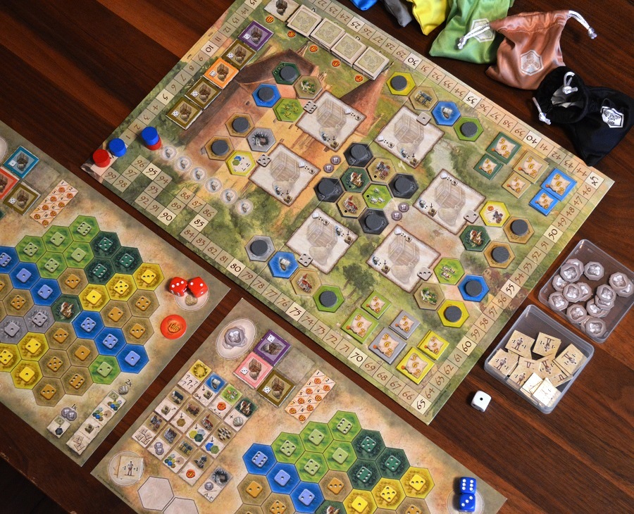 The Castles of Burgundy. Гениальная игра Фельда, которая актуальна и по сей день. Не зря она занимает 15 строчку топа BGG. Да, с не самым ярким и удобным оформлением (похожие цвета и мелкие значки – боль), и не с самыми качественными картонными компонентами, но невероятно увлекательная. Всего два кубика, а столько возможностей и вариантов.
