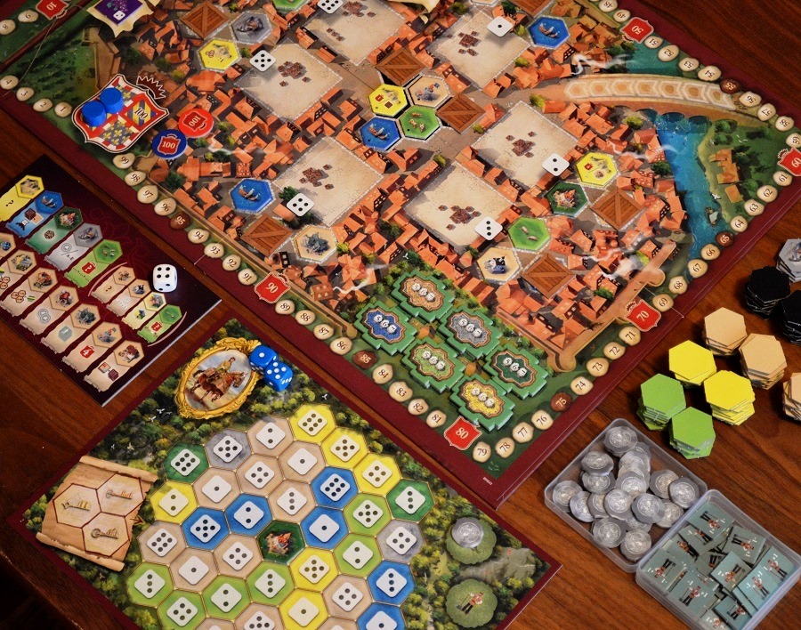 The Castles of Burgundy – юбилейное издание. Попробовали всё, кроме щитов и зданий-джокеров по цвету, используемых для экстренного завершения участков. Впервые играл с торговыми путями, с ними значимость кораблей и продажи товаров возрастает.