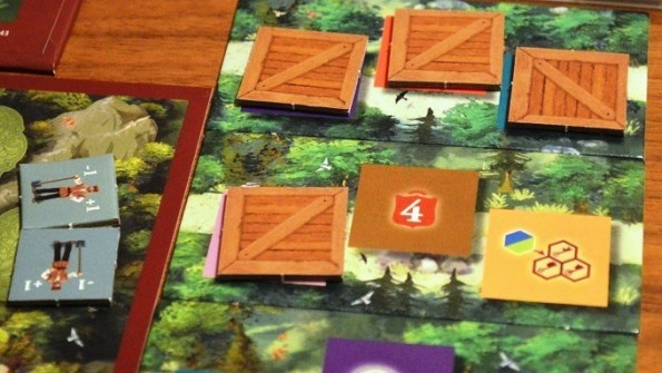 Напомню, что торговые пути – это такие плашки с цветными местами под товары. И теперь, когда игрок совершает продажу, он кладёт тайлы на первую свободную ячейку и, при совпадении цвета, помимо стандартных очков и серебра получает указанный бонус. Выходит, чтобы сорвать куш из бонусов, нужно своевременно забирать подходящие товары. Годный модуль, одобряем-с.