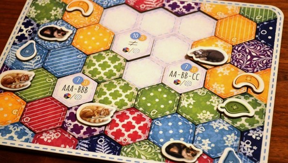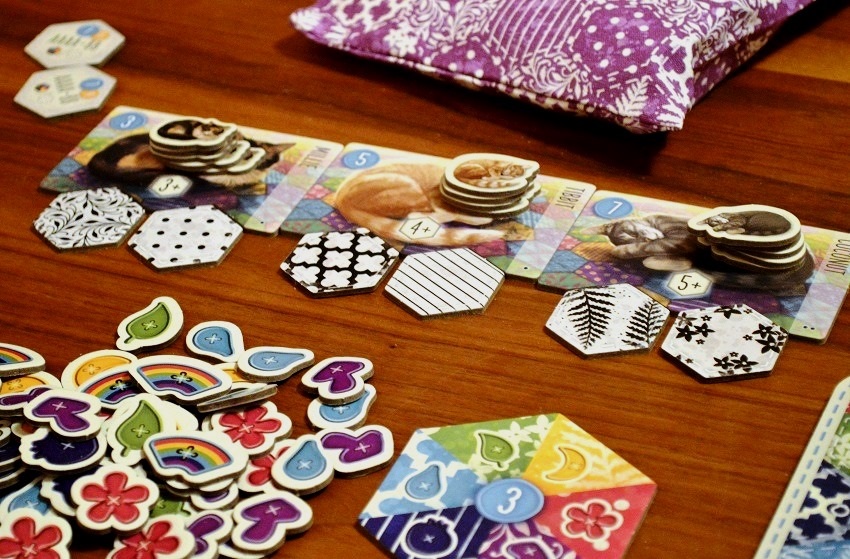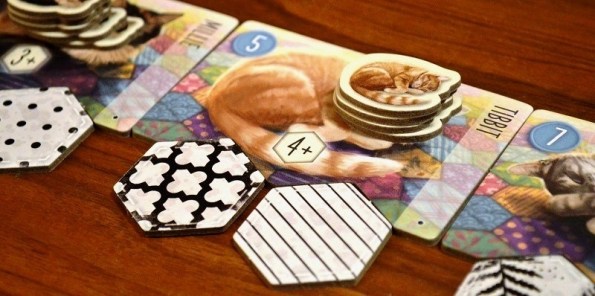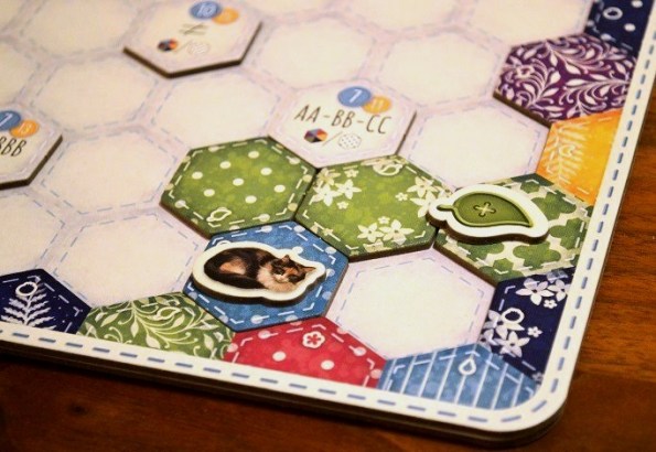 Удалось тебе, к примеру, выложить рядом четыре полосатых лоскута – берёшь жетон соответствующего котика и, как и в случае с пуговицами, помечаешь им группу, за которую начислятся очки. Отмечу ещё, что лоскуты на рамке планшета тоже считаются частью одеяла.