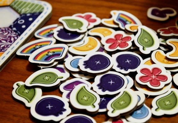 Самое простое – пуговицы. Если удалось выложить группу из трёх или более лоскутов одного цвета, то в качестве награды полагается соответствующий жетон пуговицы, который для удобства на эту же группу и кладётся. В конце партии каждая пуговица приносит 3 ПО.
