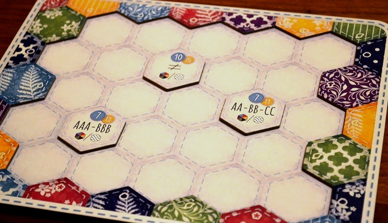Допустим, чтобы получить 7 ПО в синем кружке за жетон “ААА-ВВВ”, вокруг него а необходимо выложить комбинацию “3 лоскута одного цвета + 3 лоскута другого цвета” или “3 лоскута с одним узором + 3 лоскута с другим узором”.