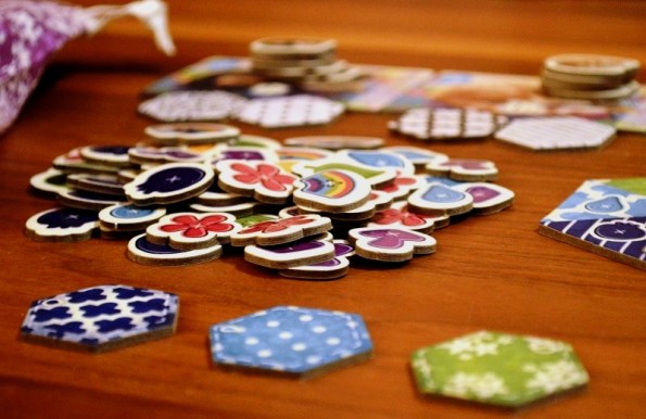Далее – жетоны целей. Их шесть разных, но на партию выбирается лишь три, которые распределяются по специальным местам на планшете. Требования на жетонах относятся к лоскутам вокруг них.