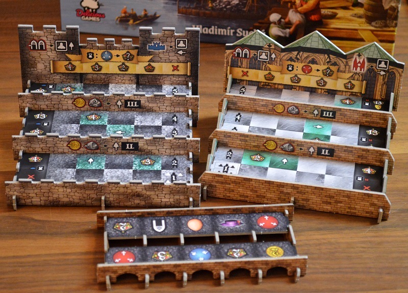 На жетонах свойство и награда в победных очках. Чем мощнее свойство, тем меньше ПО, и наоборот. Чтобы заполучить щит, нужно, во-первых, выкинуть на кубиках дубль (результат разрешается модифицировать рабочими), а, во-вторых, пожертвовать сразу двумя действиями. Но и это ещё не всё: жетон можно разместить только в свободный замок, а в конце каждого раунда перед тем, как шахты приносят доход, необходимо скинуть по одному серебру за каждый щит.