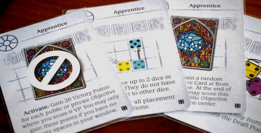 Подмастерья – это такие одноразовые плюшки, часть которых, в принципе, схожа с бонусами инструментов. Чтобы получить такую карту, на витраже нужно заполнить ячейку с соответствующим символом. Да, в дополнении для этого идёт набор специальных витражей.